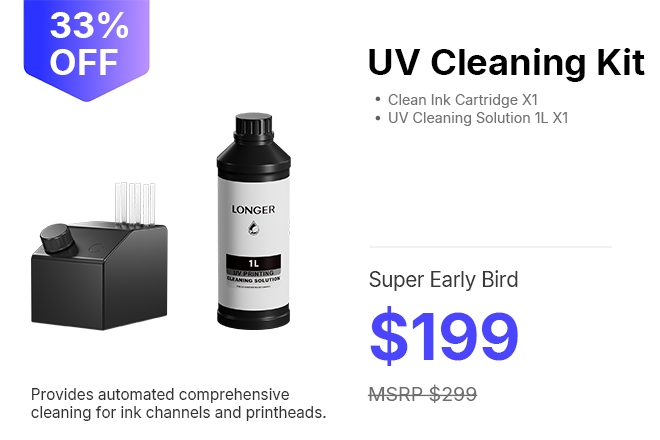 UV Cleaning Kit: Includes cleaning cartridges and UV cleaning fluid for automated maintenance of UV ink lines and printheads.