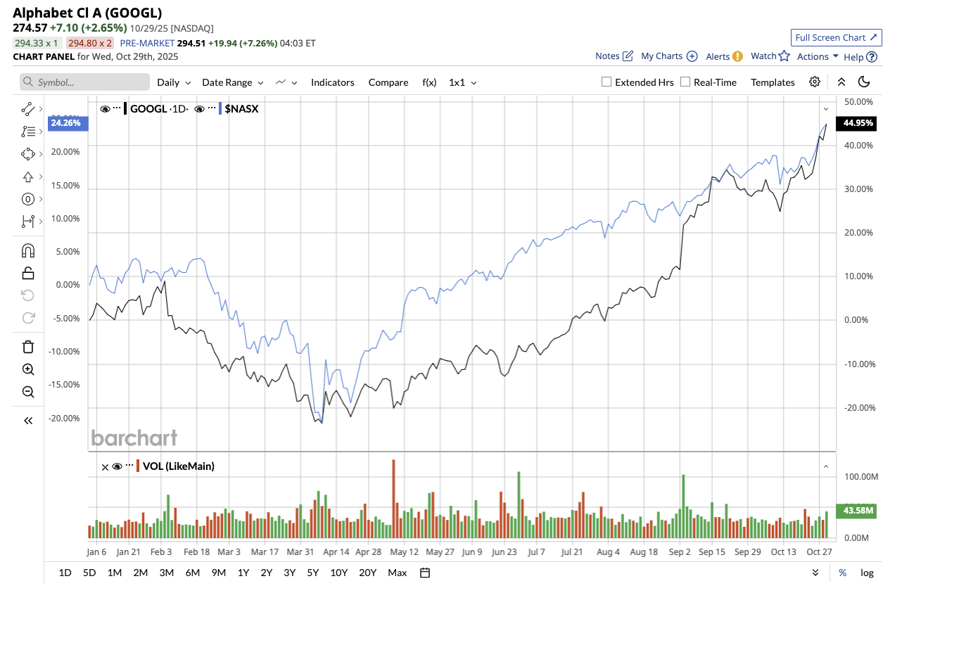 Alphabet, the parent company of Google, just delivered its first-ever $100 billion-plus quarter on Oct. 29, sending the stock up more than 3%. GOOGL stock has risen 50.3% year-to-date, surpassing the tech-heavy Nasdaq Composite Index ($NASX) gain of 23%.