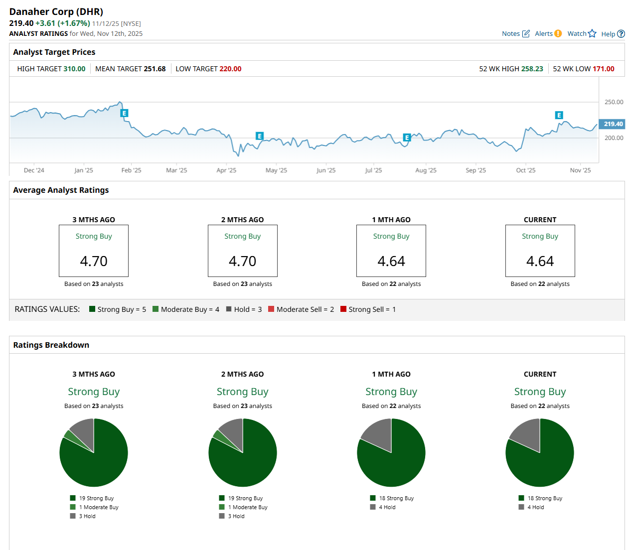 On Oct. 23, Wells Fargo & Company (WFC) maintained an “Equal Weight” rating on DHR and raised its price target to $230, indicating a 4.8% potential upside from the current levels.