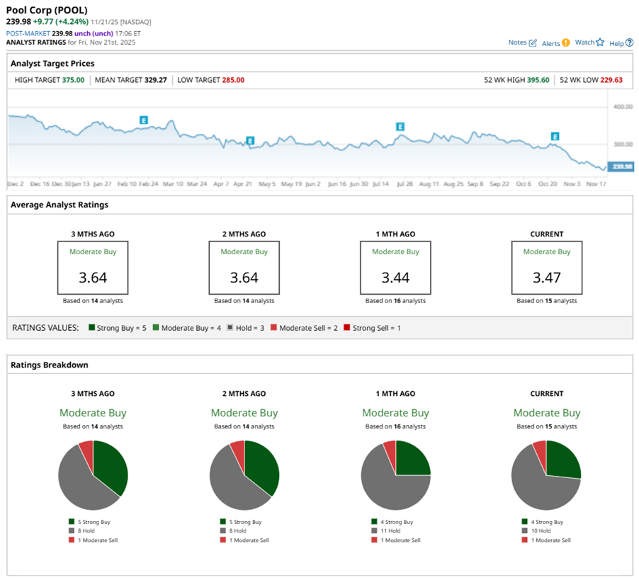 Among the 15 analysts covering POOL stock, the consensus is a “Moderate Buy.” That’s based on four “Strong Buy” ratings, 10 “Holds,” and one “Moderate Sell.”