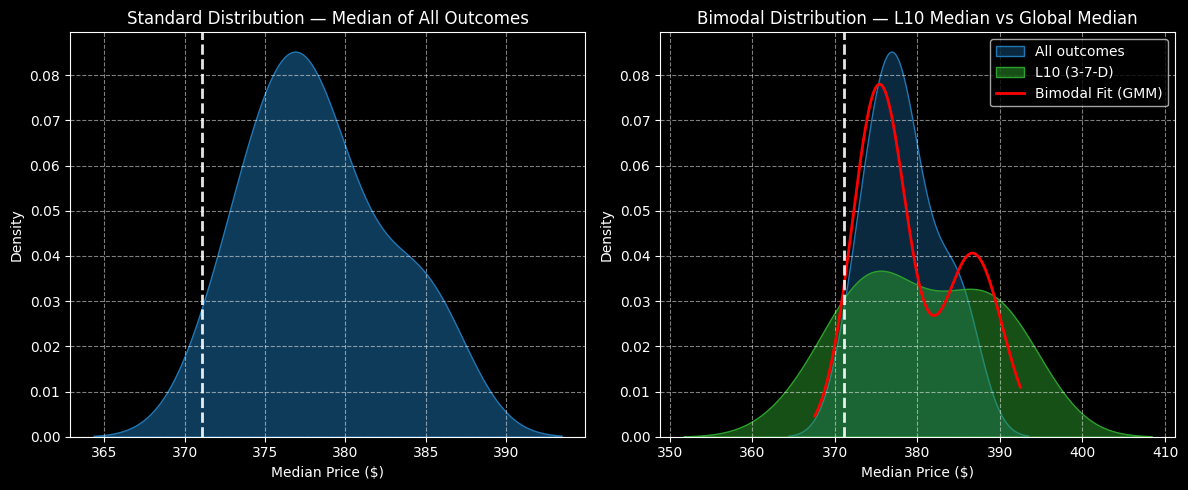 Again, using Russian axioms on a dataset going back to January 2019, Home Depot’s forward 10-week median returns can be arranged as a distributive curve, with outcomes ranging between $365 and $393 (assuming an anchor of $371.11). Further, price clustering will likely be predominant at $377.