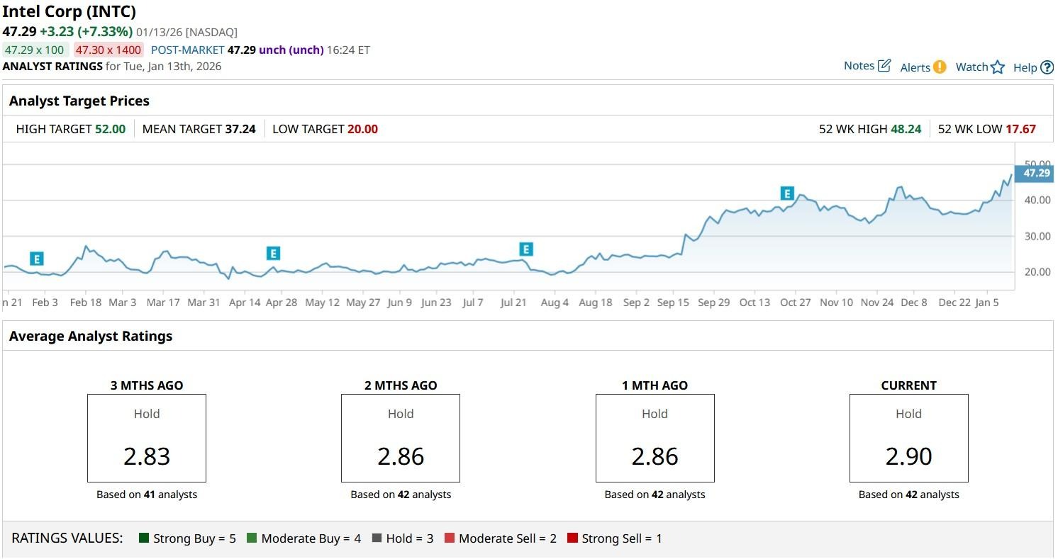 The consensus rating on Intel stock currently sits at “Hold” only, with the mean target of about $37 indicating potential downside of more than 20% from here.