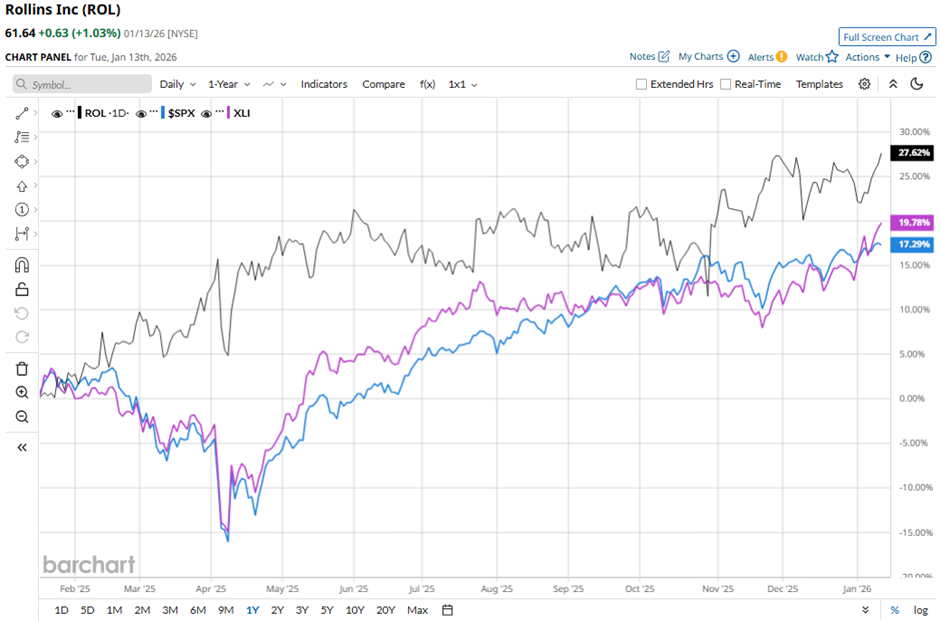 Shares of Rollins have climbed 32.6% over the past 52 weeks, outpacing both the S&P 500 Index's ($SPX) 19.3% gain and the State Street Industrial Select Sector SPDR ETF's (XLI) 23.4% return over the same period.