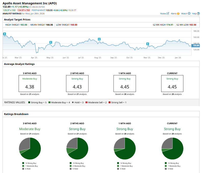 On Jan. 13, UBS analyst Michael Brown reaffirmed a “Buy” rating on Apollo Asset Management while trimming the firm’s price target to $182 from $186, reflecting a slightly more cautious outlook despite continued confidence in the company’s long-term performance.