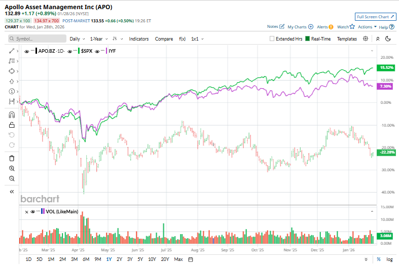 The underperformance extends to its sector peers as well, with Apollo trailing the iShares U.S. Financials ETF (IYF), which has gained 7.4% over the past year and 2.6% over the past six months.