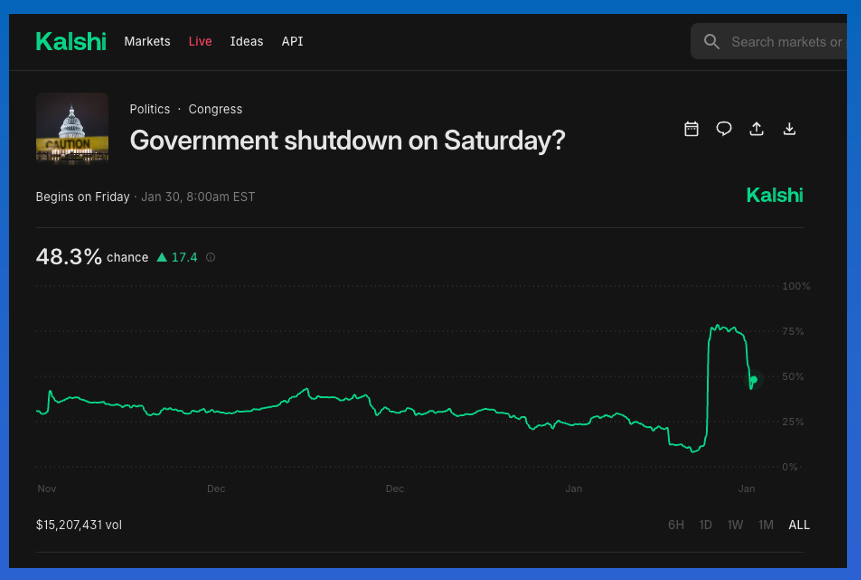 And we can't forget the US government is set to shut down at the end of January 2026, with Kalshi putting the odds earlier this week at 78%. However, this has dropped to 49% as of Thursday morning. I'm expecting continued volatility in the odds the next few days.