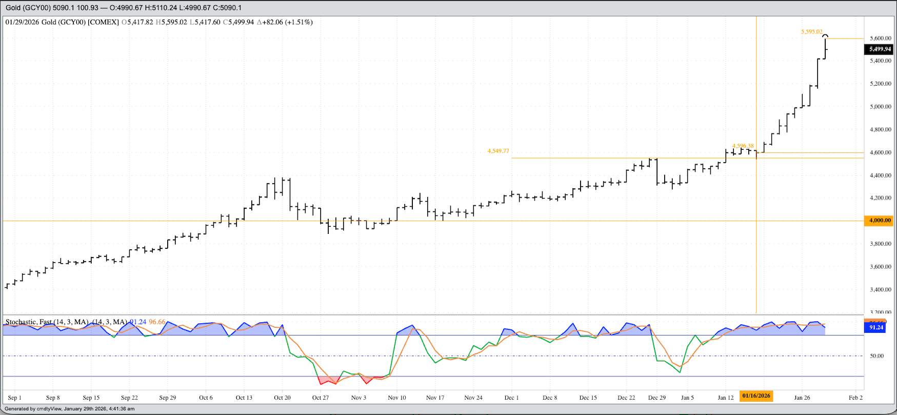 Last October, I wrote about how Gold’s Cash Index (GCY00) looked to be on the path to move beyond the $5,000 mark that month. It didn’t quite happen as the Index took a breather during November, but once we got through December and into the new year, the Index exploded, extending its historic run to a high of $5,595.02 overnight through early Thursday morning (January 29). A look at the Indexes daily chart – I’ll be talking about the Monthly Chart in my Investment Newsletter over the weekend – shows an incredible pattern since its latest downtick on January 16: