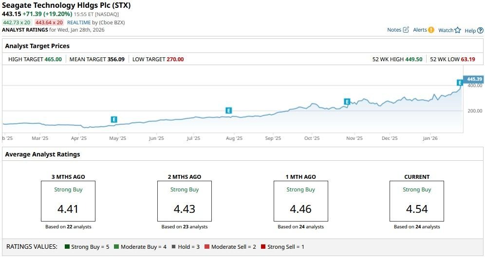 The consensus rating on Seagate Technology sits at “Strong Buy” currently, with price targets going as high as $465, indicating potential upside of another 5% from here.