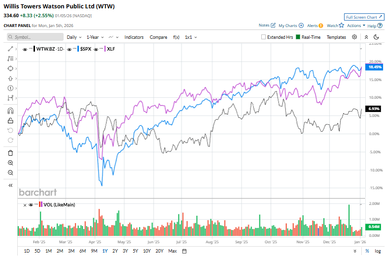 Shares of Willis Towers Watson have soared 8.3% over the past 52 weeks, trailing both the S&P 500 Index's ($SPX) 16.2% gain and the Financial Select Sector SPDR Fund's (XLF) 15.5% return over the period.