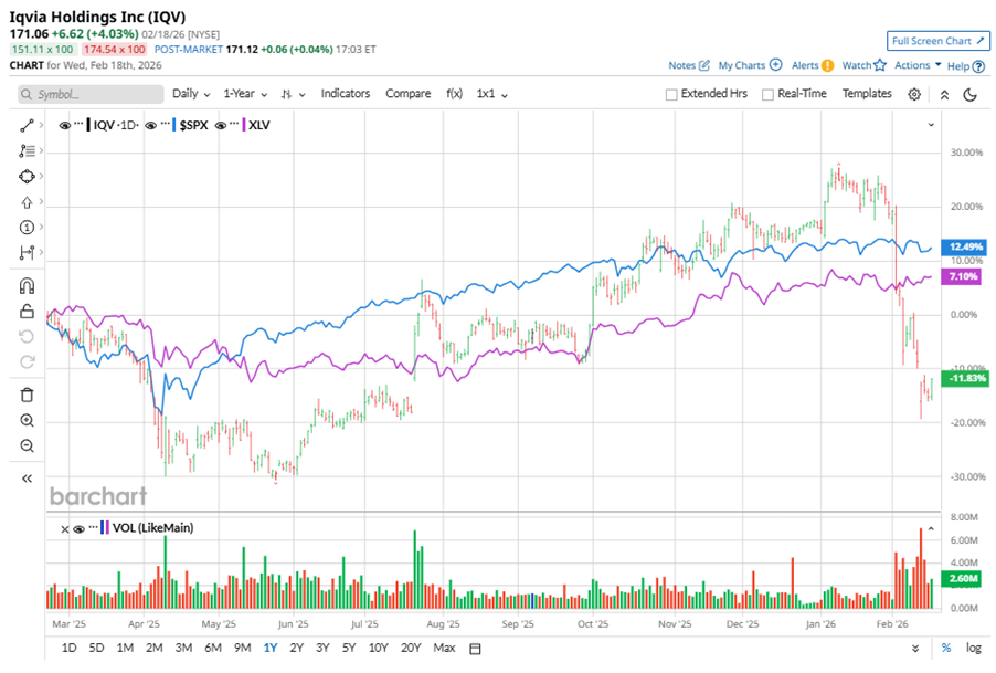 Shares of this contract research giant have underperformed the broader market over the past year. IQV has declined 11.4% over this time frame, while the broader S&P 500 Index ($SPX) has rallied nearly 12.3%. In 2026, IQV’s stock fell 24.1%, compared to the SPX’s marginal rise on a YTD basis.