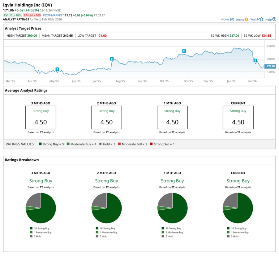 On Feb. 17, TD Cowen kept a “Hold” rating on IQV and lowered the price target to $174, implying a potential upside of 1.7% from current levels.