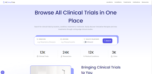 Patients often face challenges when searching for clinical trials that suit their needs, whether due to lack of awareness or difficulty navigating through complex information. AllClinicalTrials.com solves this problem by offering a seamless and intuitive platform where users can find ongoing trials based on location, condition, and other key parameters.