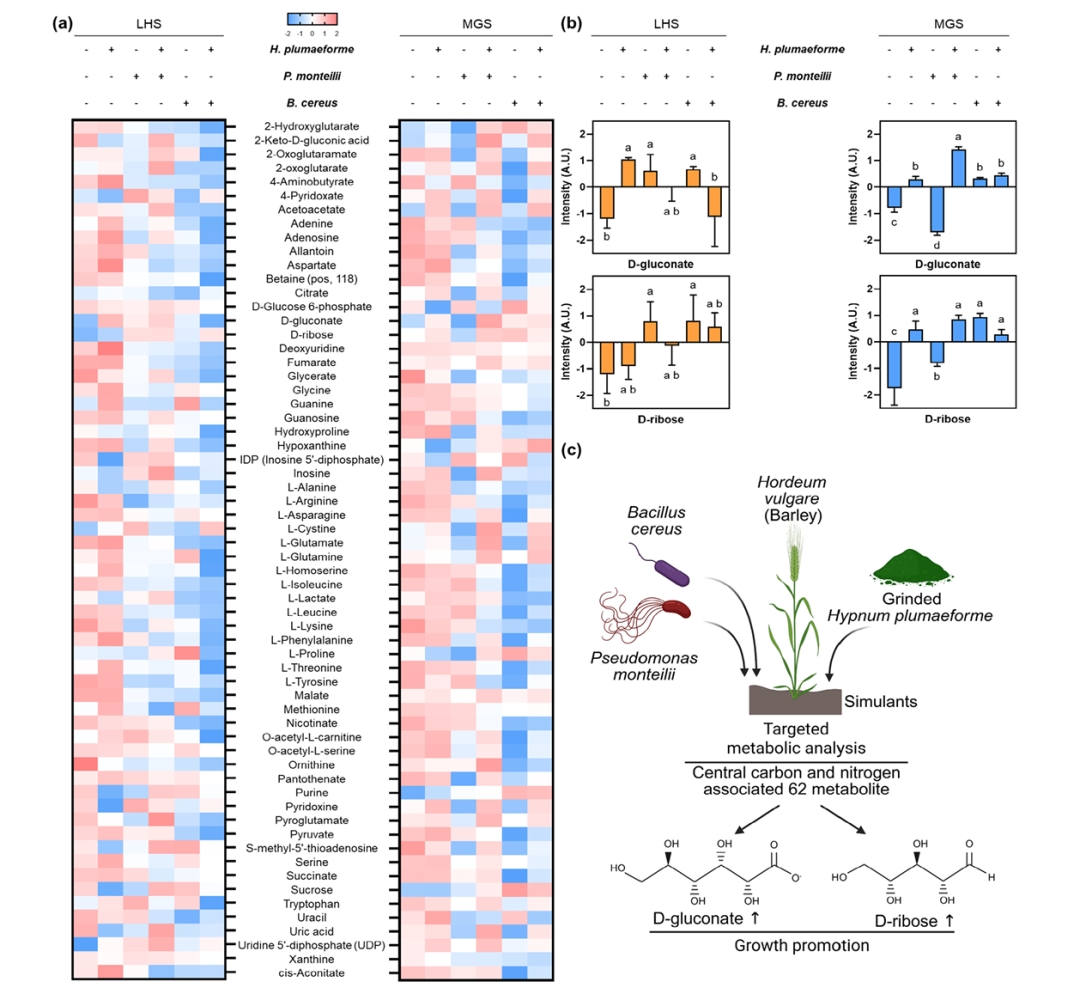 The team also found that in the moss–microbe system, plant roots accumulated D-ribose and D-gluconate, essential for energy and tissue formation — effectively re-engineering barren soil chemistry to restart life activity.