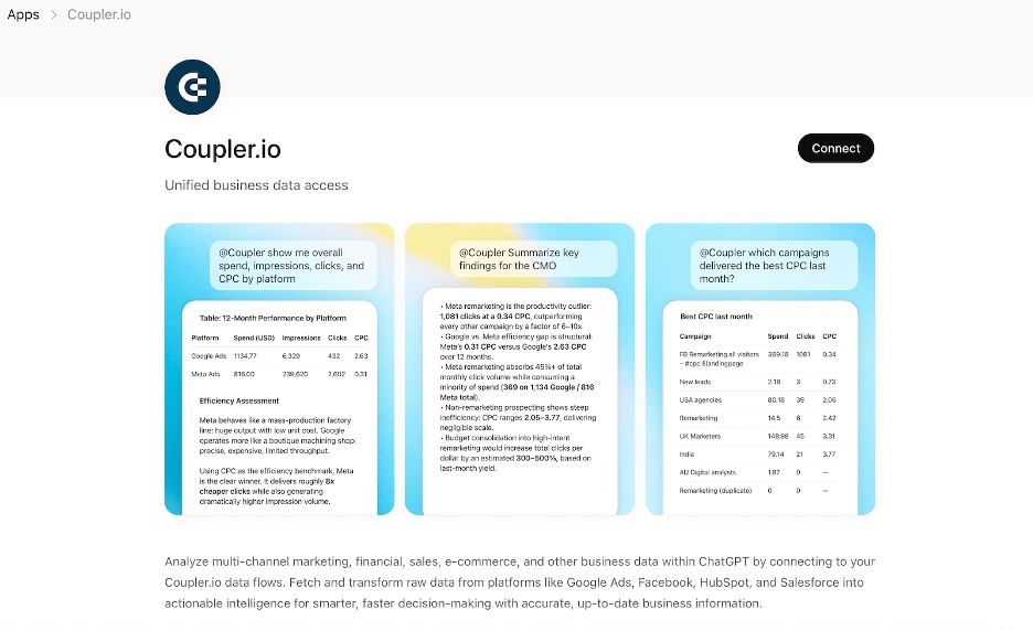 “Our app in ChatGPT changes approaches to data analytics by prioritizing accessibility and speed,” said Nika Tamaio Flores, Product Lead at Coupler.io. “You no longer need to write code, dig into SQL, or master complex BI software. Configuring Coupler.io's app in ChatGPT is simple, so you'll quickly enable AI analytics flows and move forward to actionable cross-channel insights.”