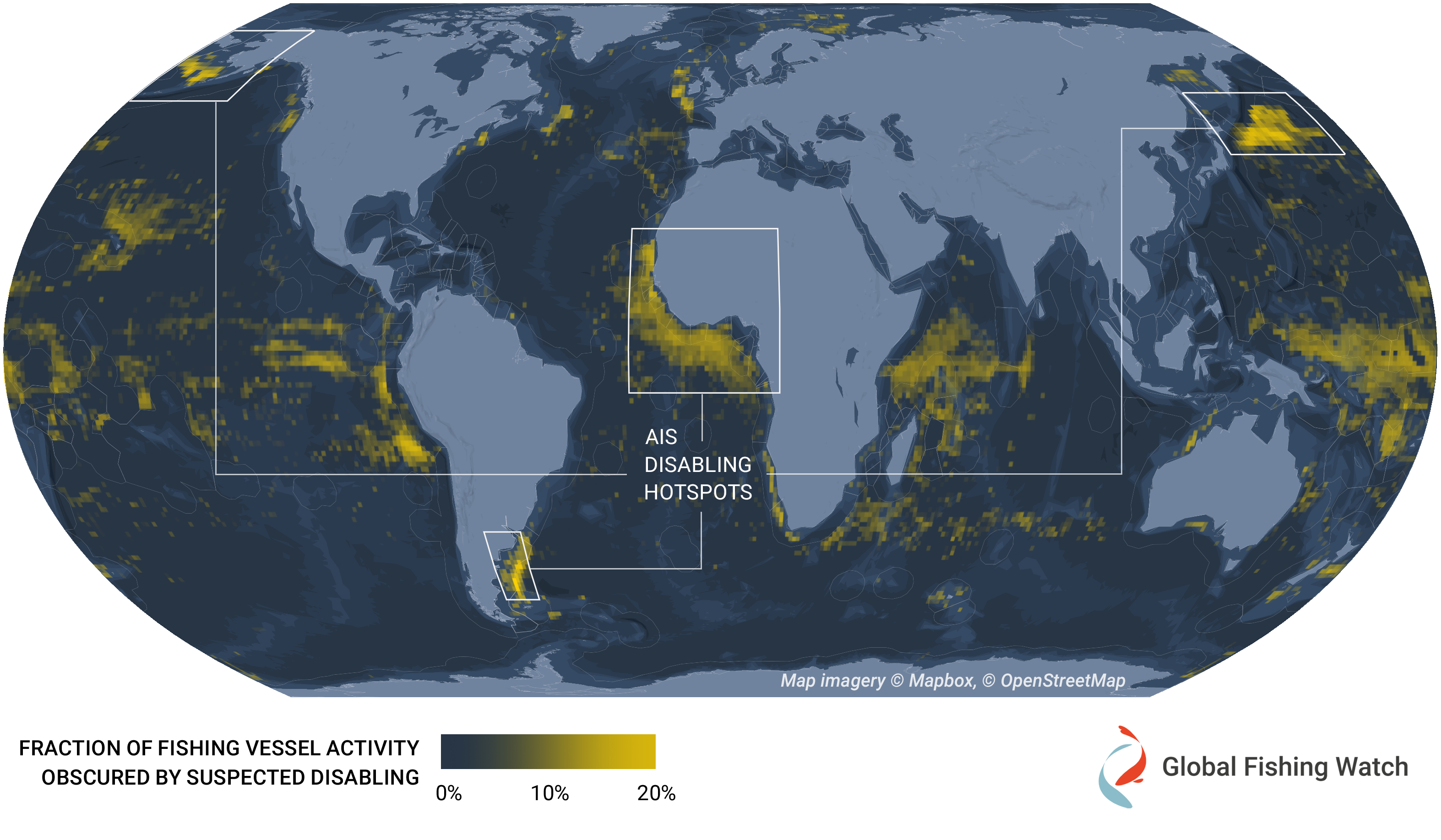 In the study, researchers identified over 55,000 suspected intentional disabling events from 2017 to 2019, obscuring nearly 5 million hours of fishing vessel activity. More than 40 percent of the total hours obscured by suspected AIS disabling occurred across four geographical locations, identified as hotspots, three of which are areas of concern for illegal fishing: the Northwest Pacific and areas adjacent to the exclusive economic zones (EEZs) of Argentina and West African nations. These areas contain rich fishing grounds with limited management oversight.