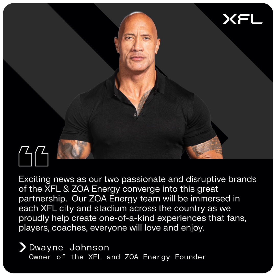 “Exciting news as our two passionate and disruptive brands of the XFL and ZOA Energy converge into this great partnership,” said Dwayne Johnson, Owner of the XFL and ZOA Energy Founder. “Our ZOA Energy team will be immersed in each XFL city and stadium across the country as we proudly help create one-of-a-kind experiences that fans, players, coaches, and everyone will love and enjoy.”
