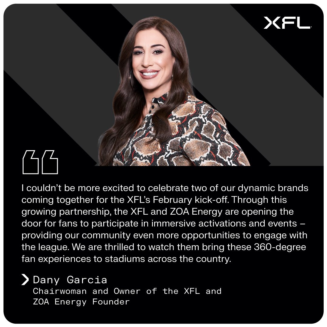 “I couldn’t be more excited to celebrate two of our dynamic brands coming together for the XFL’s February kick-off,” said Dany Garcia, Chairwoman and Owner of the XFL and ZOA Energy Founder. “Through this growing partnership, the XFL and ZOA Energy are opening the door for fans to participate in immersive activations and events - providing our community even more opportunities to engage with the league. We are thrilled to watch them bring these 360-degree fan experiences to stadiums across the country.”