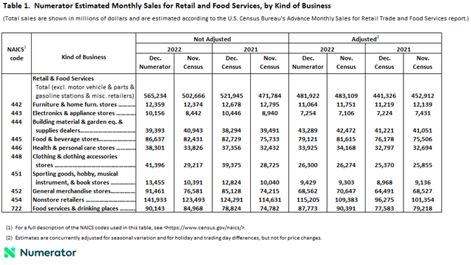 CHICAGO, Jan. 17, 2023 (GLOBE NEWSWIRE) -- Numerator, a data and technology firm advancing market research, has released its monthly Numerator Retail Sales Report, an advance projection of the U.S. Census Bureau’s monthly retail and food services sales report, excluding motor vehicle & parts, gasoline, and miscellaneous retailers. Both Numerator and the U.S. Census Bureau adjust for seasonal variation and holiday and trading-day differences, but not for price changes. According to the Numerator Retail Sales Report, projected retail sales, with noted exclusions, were $482 billion in December 2022, down 0.2% from the previous month and up 9.2% compared with December 2021.