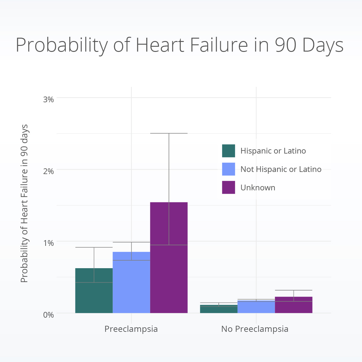 Truveta Research found that the chance of having heart failure within 90 days of delivery is greater for women who experienced preeclampsia during their pregnancy. They also found this to be true within each race group; white women with preeclampsia were 5.3 times, Black women were 3.5 times, and Asian women were 8.0 times more likely to have heart failure post-delivery than their counterparts without preeclampsia. Similarly, Hispanic or Latino women were 5.5 times, non-Hispanic or non-Latino women were 4.9 times, and women of unknown or other Hispanic or Latino ethnicity were 6.9 times more likely to experience heart failure post-delivery than their counterparts without preeclampsia.