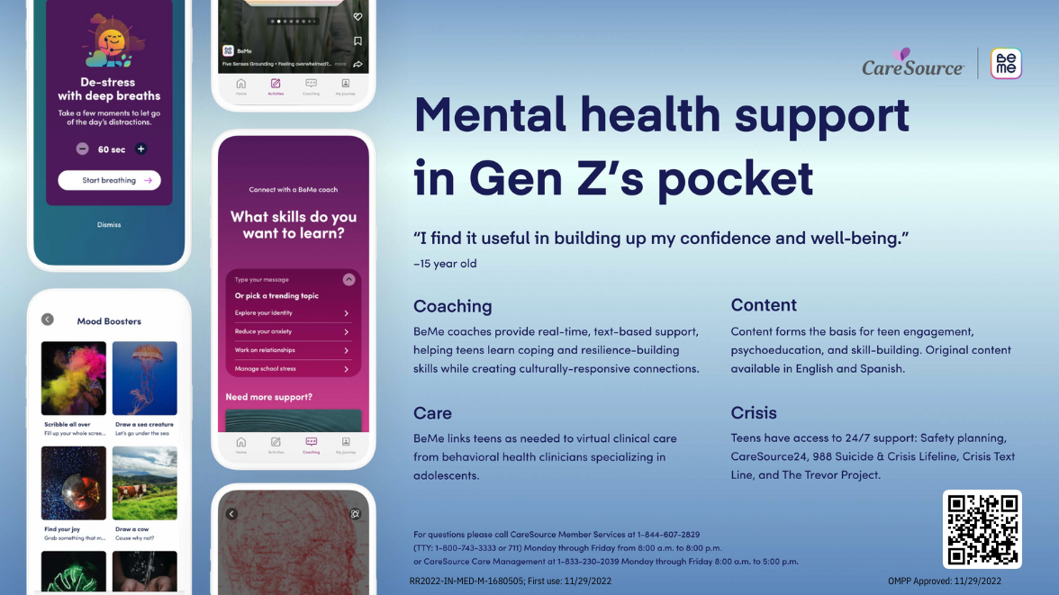 CareSource provides health coverage to nearly 19,200 teens through Hoosier Healthwise, part of Indiana’s state Medicaid program. Through the BeMe and CareSource partnership, these individuals will have mobile access to mental health support including content, care activities and real-time one-on-one coaching, as well as clinical services and crisis support as needed.