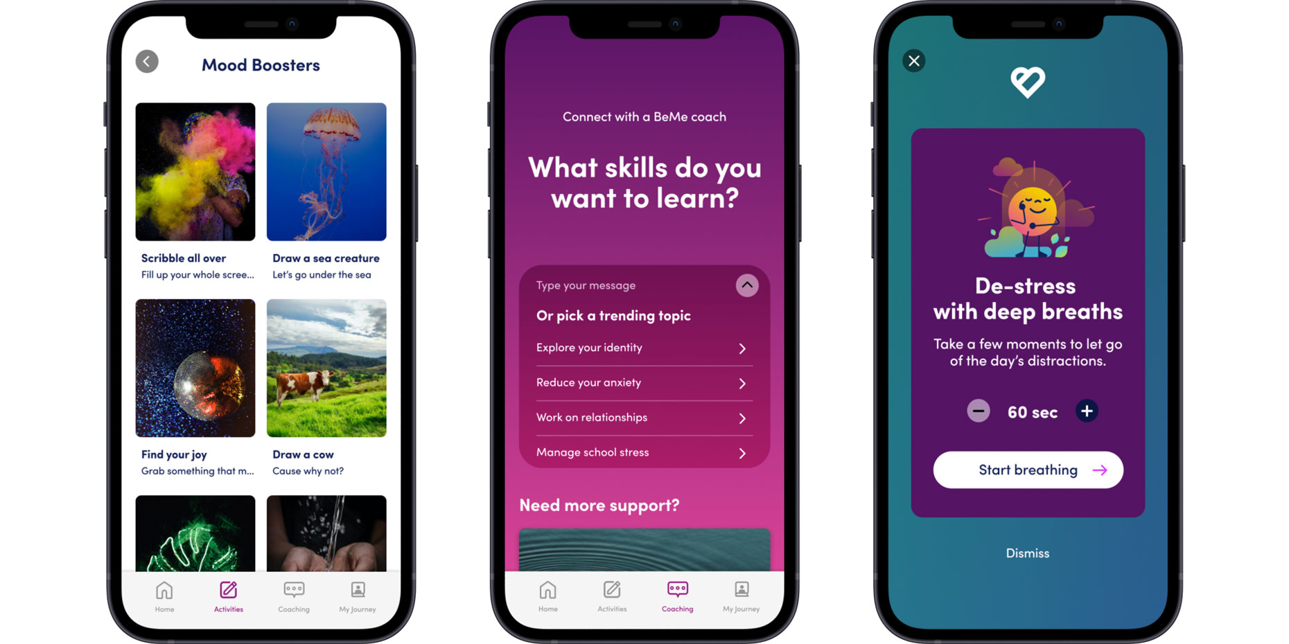 BeMe Health is a digital behavioral health company that delivers mental health interventions designed specifically for teens. The BeMe app provides mobile access to content, care activities, real-time coaching, as well as clinical services and crisis support as needed. BeMe is designed entirely with teens in mind, meeting them where they are – on their phones – in a fun, safe, familiar mobile modality that combines science-backed digital tools with live human connection for maximum support and impact.