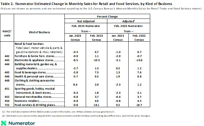 CHICAGO, March 14, 2023 (GLOBE NEWSWIRE) -- According to the Numerator Retail Sales Report, projected retail sales (excluding motor vehicle & parts, gasoline, and miscellaneous retailers) were $487 billion in February 2023, down 1.0% from the previous month and up 6.7% compared with February 2022 on a seasonally adjusted basis.