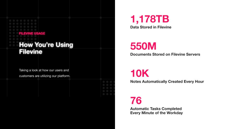 Front and center in this year’s report was the rise of remote work. As legal work becomes increasingly cloud-based and remote-first, we see a heightened need for a connecting and automation tool like Filevine to streamline processes and make managing tasks more efficient and productive. The increased reliance on technology is further demonstrated in Filevine’s usage stats. Filevine’s online document editors have saved legal workers approximately 100-years of time downloading, editing, saving, and re-uploading documents, and more than 1000 TB of legal data is stored in Filevine, including 550 Million documents, files, contracts, videos, messages and more.