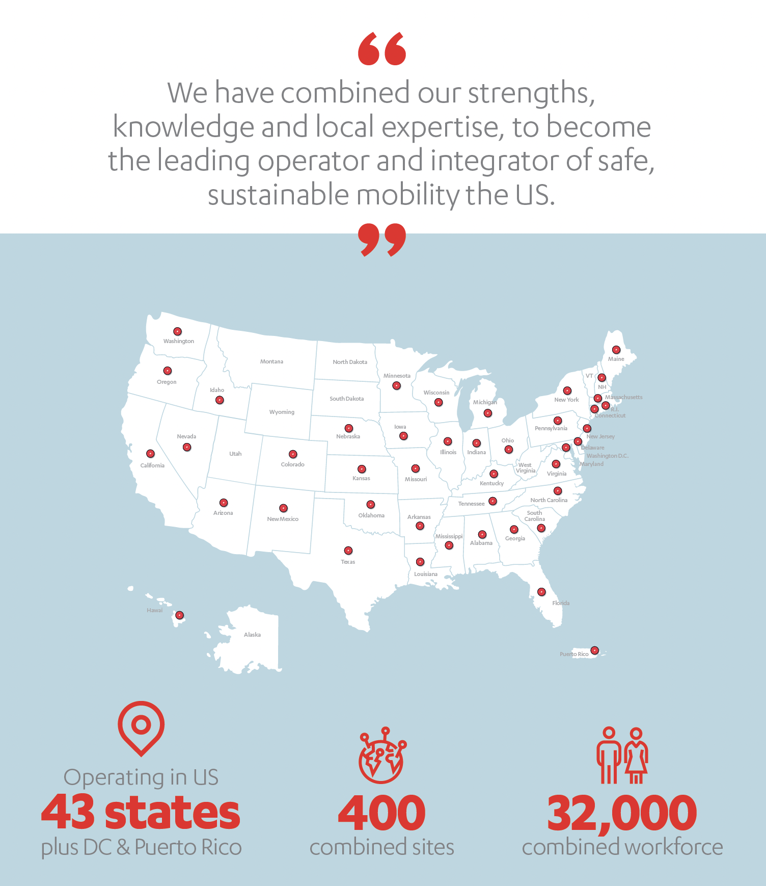 for communities, schools, universities, airports, and businesses. The combined company will employ more than 35,000 people, with a fleet of more than 20,000 vehicles (owned or operated) and will maintain an additional fleet of some 39,000 vehicles and equipment across the United States, through a dedicated division.