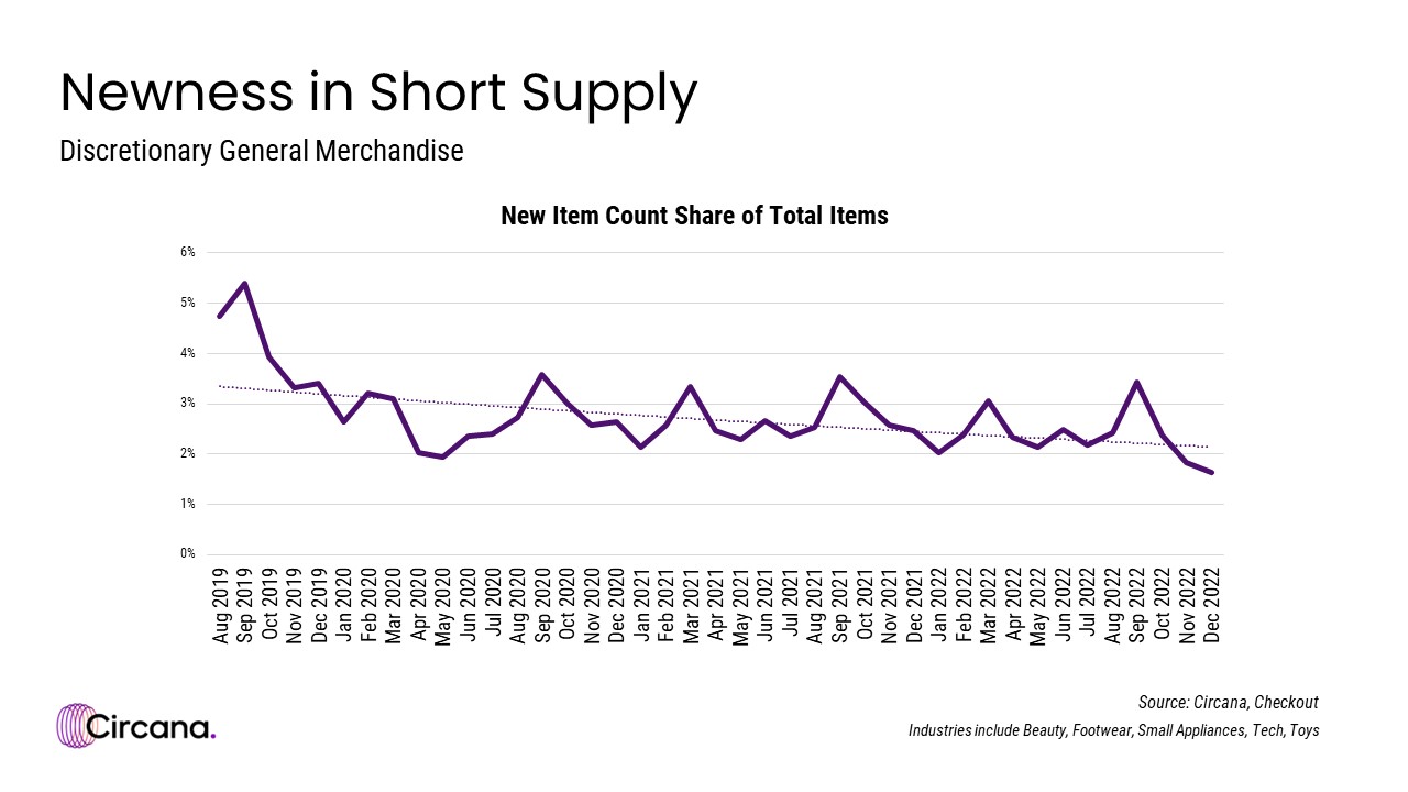 Investment in new product development was understandably put on hold due to uncertainties caused by the pandemic when most companies adjusted priorities to fulfill demand, addressed supply chain issues, and then focused on selling excess inventory. Before the pandemic, new general merchandise products represented more than 5% of the market. By the end of 2022, that number was less than 2%.