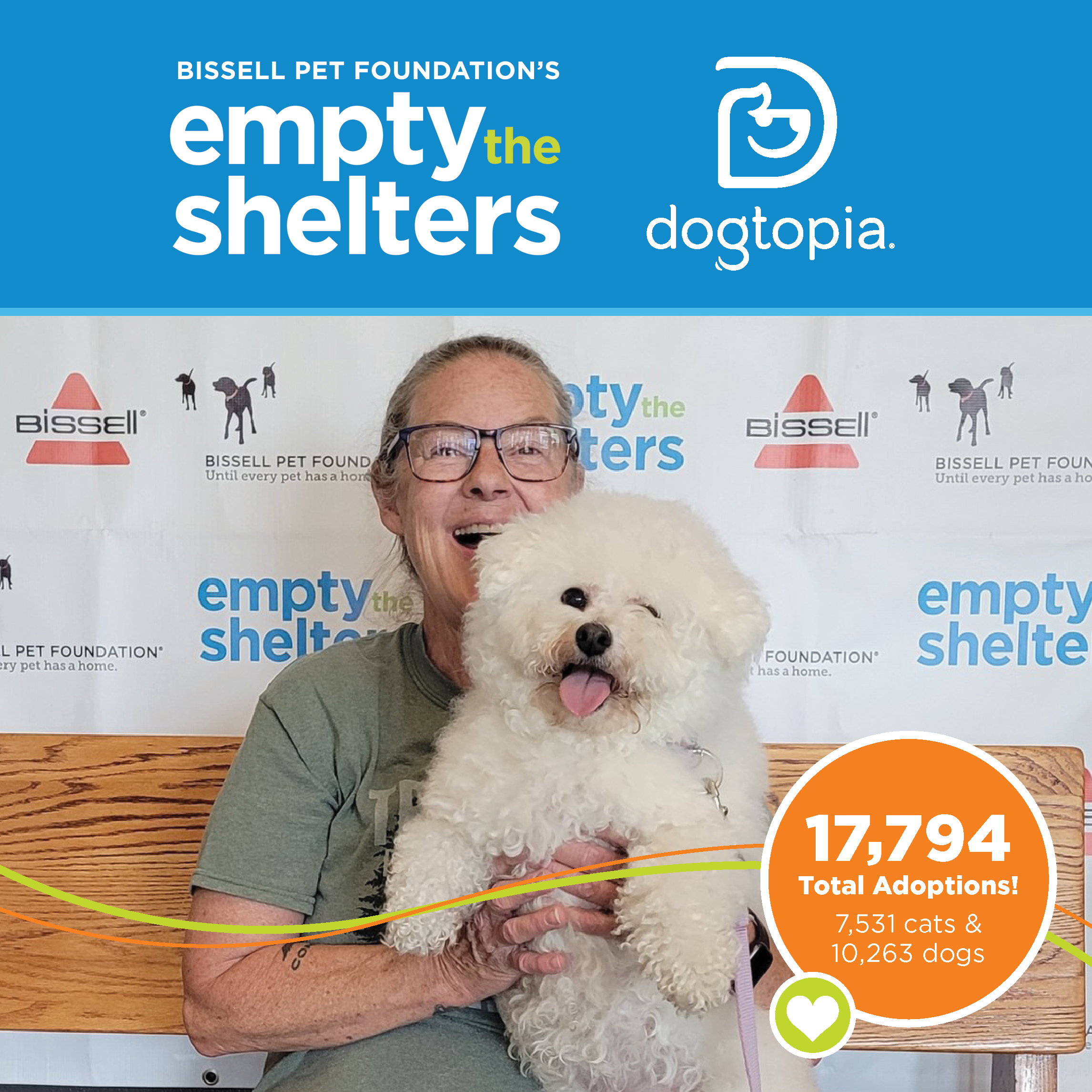 "We are truly grateful to every adopter who opened their heart and home to a pet during a time when shelters nationwide are experiencing unprecedented challenges." said Cathy Bissell, Founder of BISSELL Pet Foundation. "Increased owner surrenders due to evictions and housing restrictions, lack of access to veterinary care and financial challenges brought on by inflation are contributing to increased length of stays for many highly adoptable pets. Our partnership with Dogtopia allowed us to host this event at more organizations than ever before, helping nearly 1,200 pets to be adopted daily at 364 organizations in 45 states—a new record for our 'Empty the Shelters' event! We are thrilled so many pets found loving homes thanks to this lifesaving partnership!"