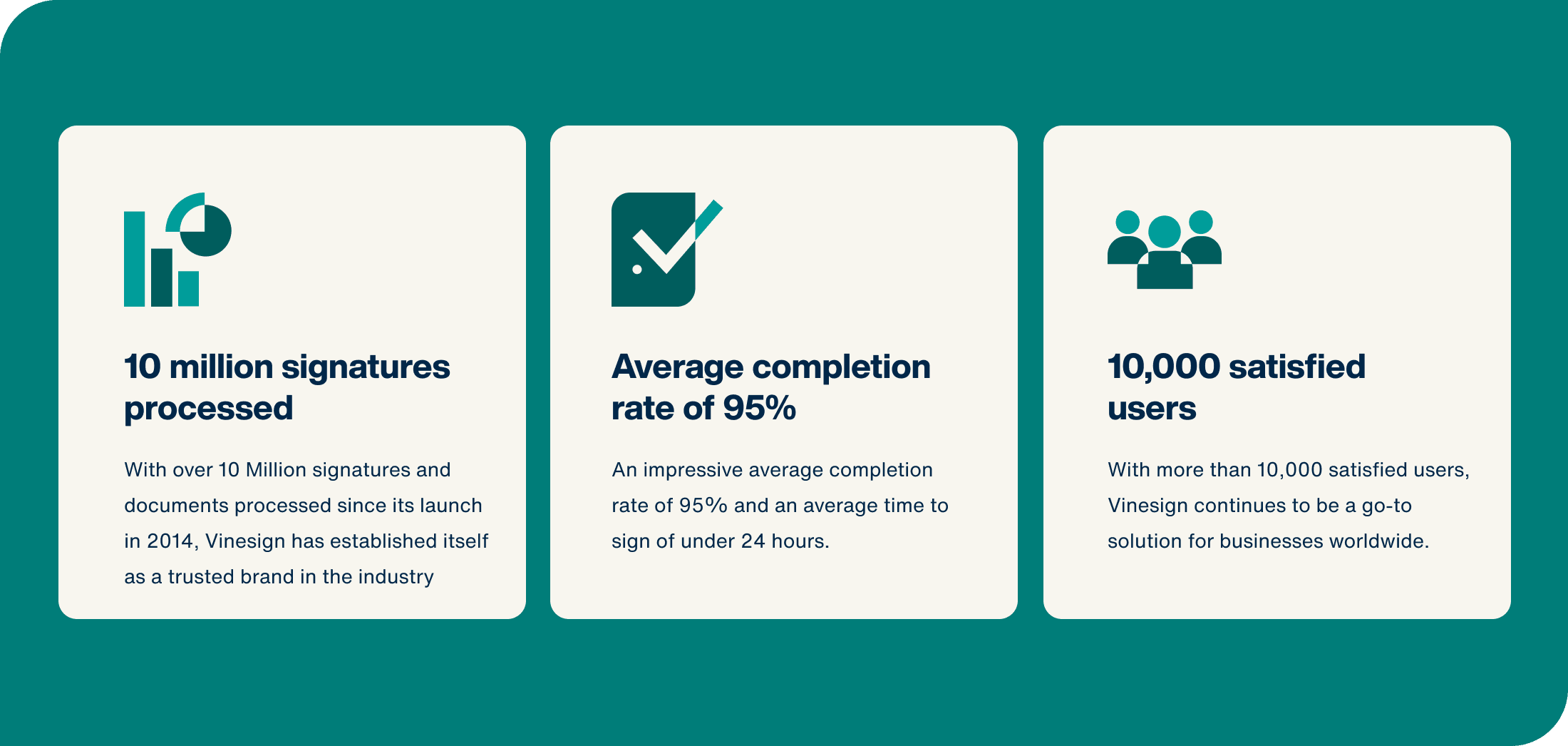 With over 10 million signatures and documents processed since its launch, Vinesign has established itself as a trusted brand in the industry. It boasts an impressive average completion rate of 95% and an average time to sign of under 24-hours. With more than 10,000 satisfied users, Vinesign continues to be a go-to solution for businesses worldwide.