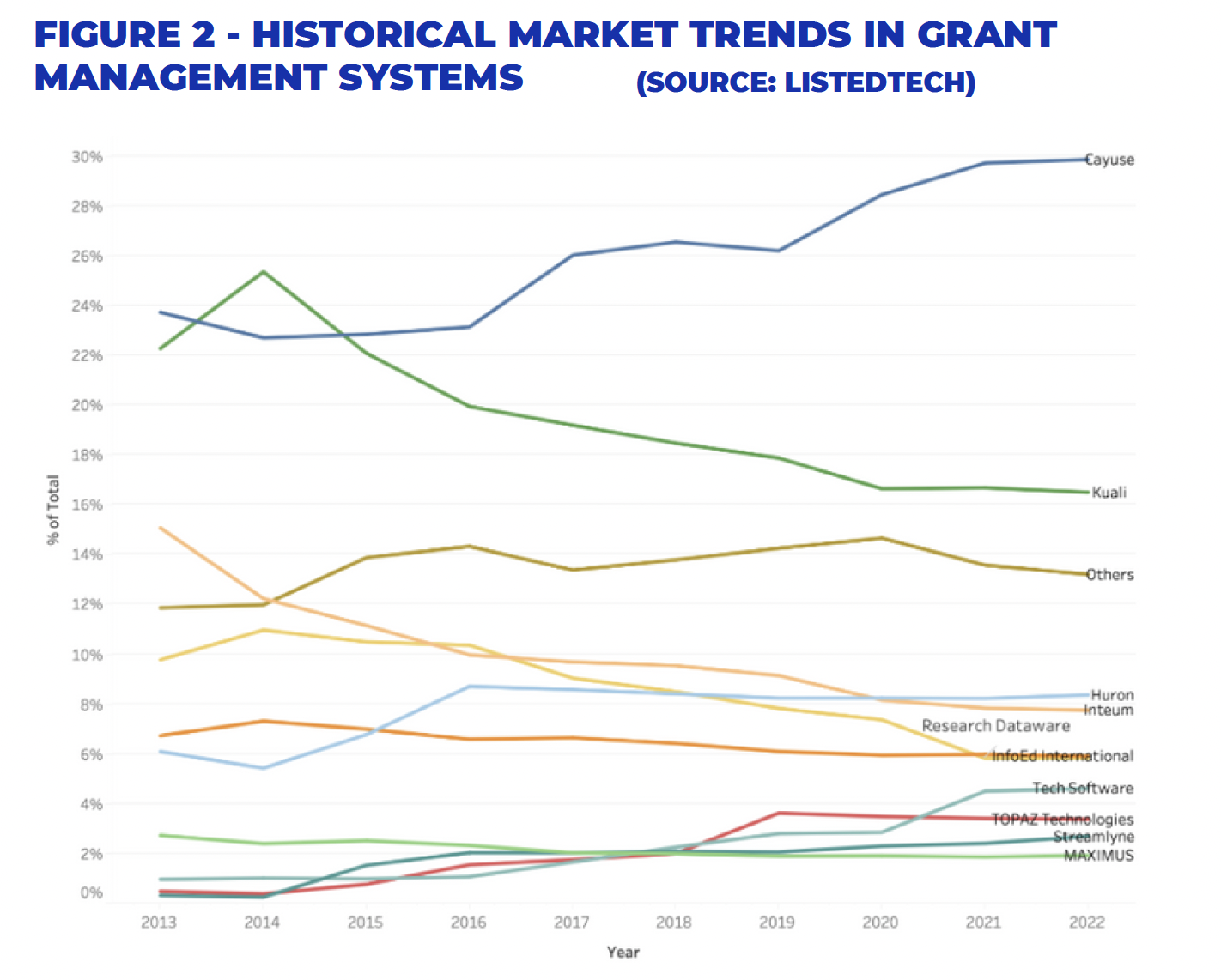In the context of the past decade’s market trends, Cayuse again remains the overall market leader, as shown in Figure 2. Unlike the 2022 report, the 2023 report does not include homegrown systems and focuses solely on vendor solutions. However, the authors estimate that homegrown systems currently represent about 25% of the market.