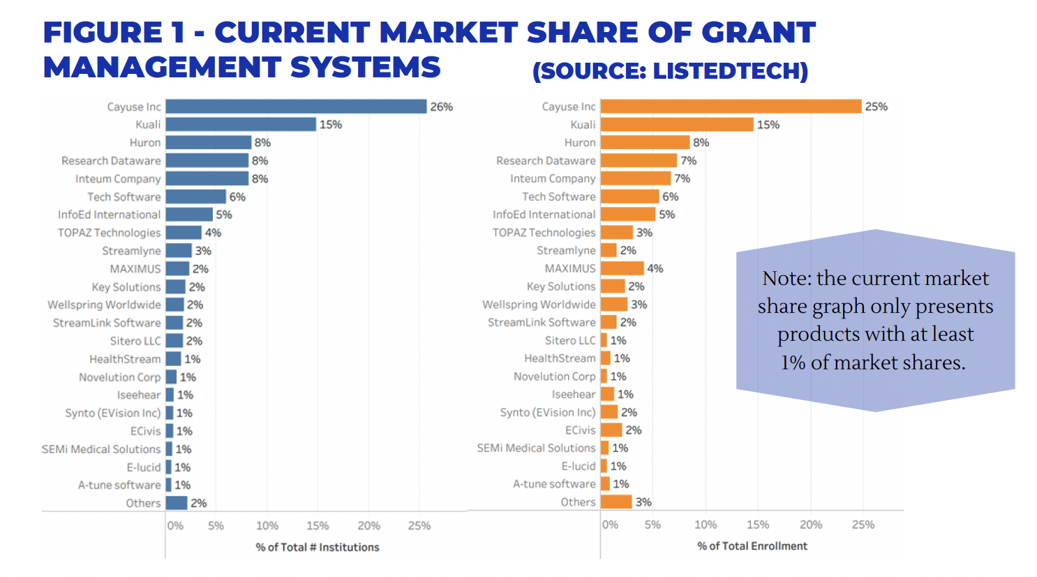 Figure 1 shows the eRA software market leaders by the percentage of clients based on unique higher education institutions (left graph) and as a percentage of the total student enrollment within each client institution (right graph). Similar to the 2022 report, Cayuse remains the market leader in both cases.