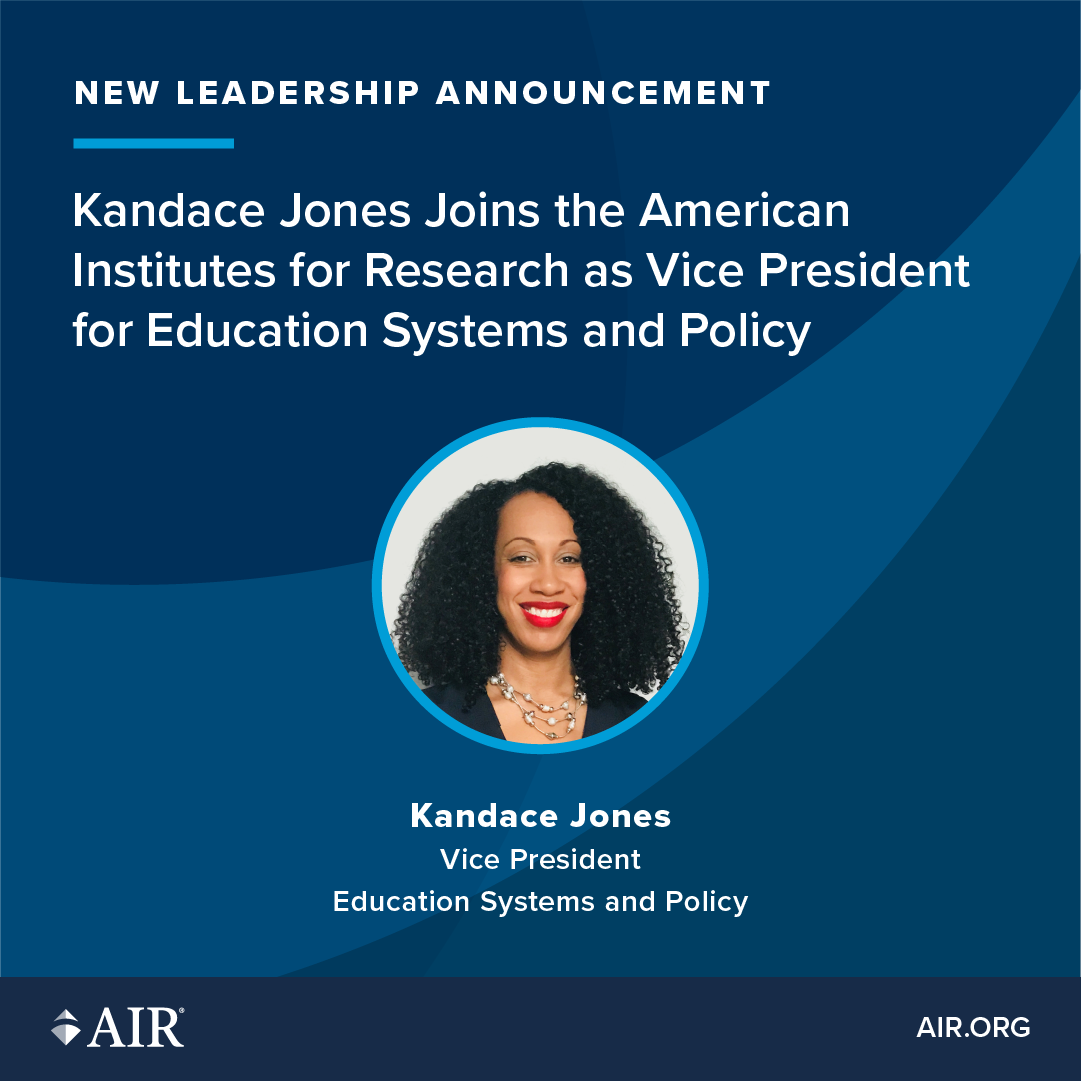 Arlington, Va., Sept. 07, 2023 (GLOBE NEWSWIRE) -- The American Institutes for Research has welcomed Kandace Jones as vice president to lead the institution’s education systems and policy program area. Jones is an expert in providing technical assistance to states, school districts, and other entities to improve student outcomes and increase equity in education.