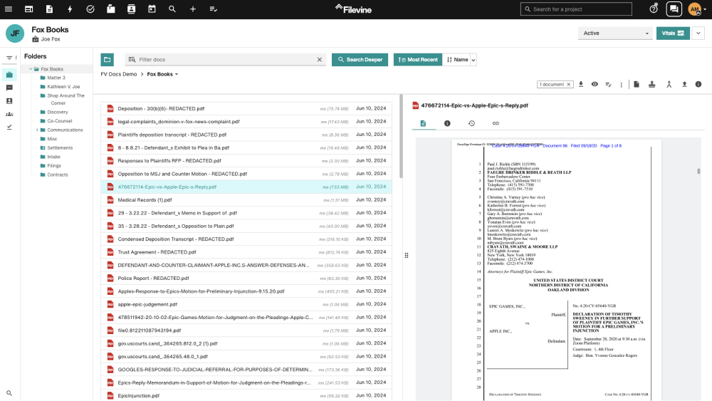 In addition to eliminating document storage limitations and added fees, Docs by Filevine also introduces a wide range of features that change the game for legal professionals, who spend much of their day dealing with documents. The package includes several features not offered by other solutions, including a project activity feed, enhanced optical character recognition (OCR) capabilities, e-signature collection, efax, contact management, task management collaboration tools, email integration, texting, and basic reporting. It also includes the free version of Filevine’s AI-powered virtual assistant tool, SidebarAI, giving users 7-day look-back summaries to help track tasks and stay on top of communication, and AI Document Review, which uses the power of AI to extract and organize information from documents.