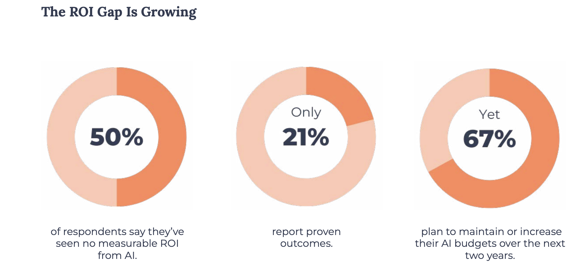 - 67% of organizations expect to maintain or increase AI spending, yet only 21% report any proven outcomes