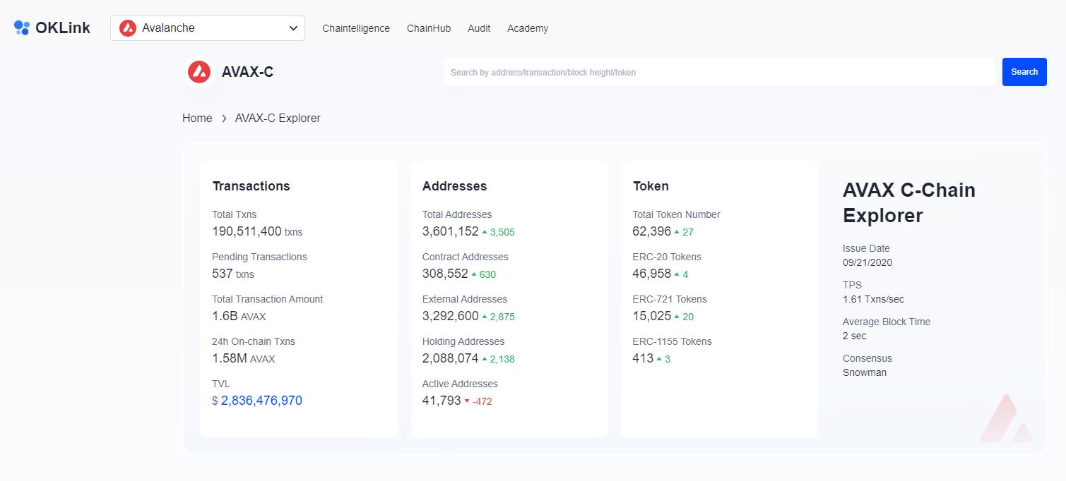 C-Chain allows for the creation and execution of smart contracts. Because it is EVM (Ethereum Virtual Machine) compatible, Avalanche's smart contracts can take advantage of cross-chain interoperability. And according to the OKLink team, its multi-chain explorer matrix now consists of more EVM series explorers, and the choice of supporting another EVM-compatible one would further strengthen the advantage of the multi-chain explorer product.
