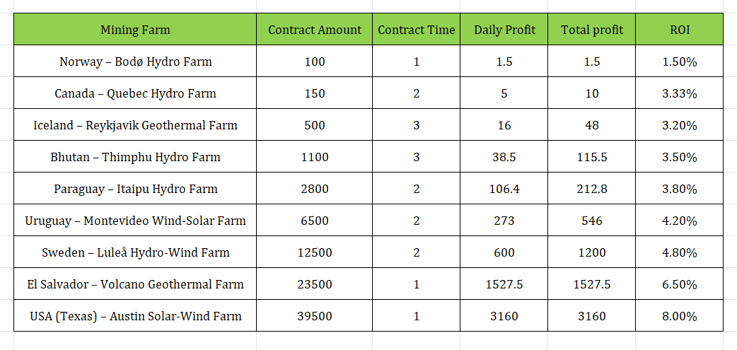 DeepHash offers a wide range of Bitcoin cloud mining contracts tailored for different investor groups. Below is a sample, including the flagship Texas Solar-Wind 3160PH Cloud Contract, which generates $3,160 in daily profit: